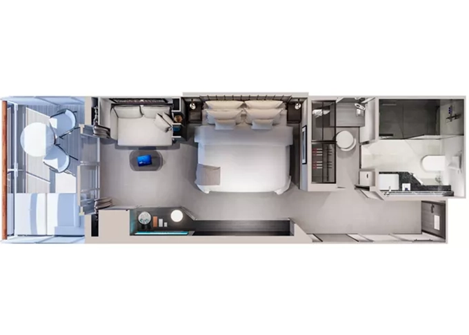 | Ocean Suites - Ocean Terrace Suite OT1 Suita 28 m² + kúpeľňa 4 m² + terasa 7 m². 6. paluba stred / 7. paluba vpredu, vzadu. Spálňa s obývacou časťou, šatník. Minibar, kávovar, vodná kanvica, ďalekohľad, sejf, kúpeľňa so sprchou. Fľaša šampanského na privítanie. Maximálna kapacita 2 dospelé osoby + 1 dieťa do nedovŕšených 18 rokov. | 5 510 € 5 510 € za osobu | ||