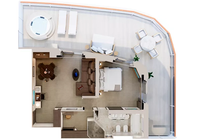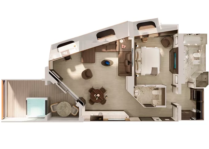 | Retreat Residence Suita 63 m² + Terasa s vírivkou a sedením 14 m² / 7. paluba: 18 m². Spálňa s obývacou a jedálenskou časťou, šatník. Koktailová súprava, minibar, kávovar, vodná kanvica, ďalekohľad, sejf, mramorová kúpeľňa s vaňou a sprchou, extra wc. Taška Technogym Case Kit. Fľaša šampanského na privítanie. Služby osobného majordóma. Maximálna kapacita 3 dospelí alebo 2 dospelí + 2 deti pod 18 rokov. | 16 570 € 8 285 € za osobu | ||