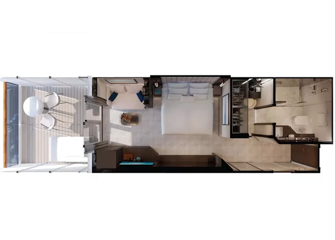 | Ocean Residence - Cove Residence Suita + terasa so sedením a lehátkami 56 m². Spálňa s obývacou a jedálenskou časťou, šatník. Koktailová súprava, minibar, kávovar, vodná kanvica, ďalekohľad, sejf, kúpeľňa so sprchou. Závesy, svetlo, klimatizácia ovládané smart technológiou. Taška Technogym Case Kit. Fľaša šampanského na privítanie. Maximálna kapacita 3 osoby. | 20 920 € 5 230 € za osobu | ||