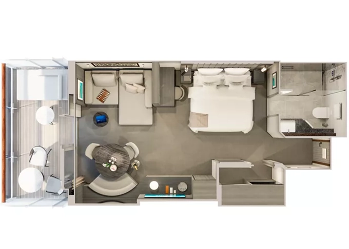 | Ocean Suites - Ocean Grand Terrace Suite Suita 28 m² + kúpeľňa 4 m² + terasa so sedením a pohovkou 11 m². 6/7. paluba. Spálňa s obývacou časťou, šatník. Minibar, kávovar, vodná kanvica, ďalekohľad, sejf, kúpeľňa so sprchou. Fľaša šampanského na privítanie. 6, 7. paluba. Maximálna kapacita 2 dospelé osoby + 1 dieťa do nedovŕšených 18 rokov. | 9 000 € 4 500 € za osobu | ||
