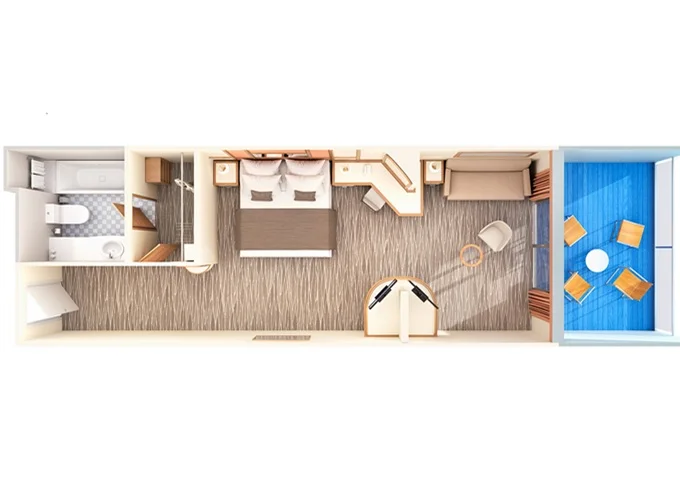 | 8D - Kajuta s balkónom 21,5 m² (vrátane balkóna). 12. paluba stred, vzadu; 14. paluba vpredu. | 1 006 € 503 € za osobu | ||