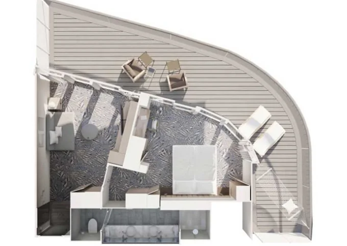 | SUGO - Große Freiheit Suite 88 m² + balkón 43 m² so stolom, ležadlami + balkón s hojdacou sieťou. 2 spálne, 2 kúpeľne, šatník, infračervená sauna. 9,10. paluba. Max 6 osoby. Výhody Suite. | 28 755 € 5 751 € za osobu | ||